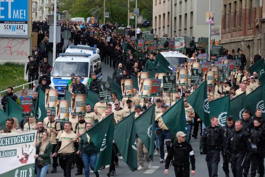 Tilhengere av det høyreekstreme partiet Den tredje vei marsjerte 1. mai i Plauen i Øst-Tyskland. Foto: AP / NTB scanpix