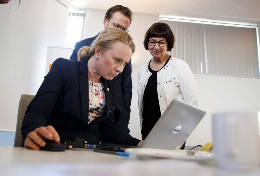 Arbeids- og sosialminister Anniken Hauglie (H) på besøk hos Nav-sjef Sigrun Vågeng. I bakgrunnen digitaliseringsminister Nikolai Astrup (H). Foto: Vidar Ruud / NTB scanpix