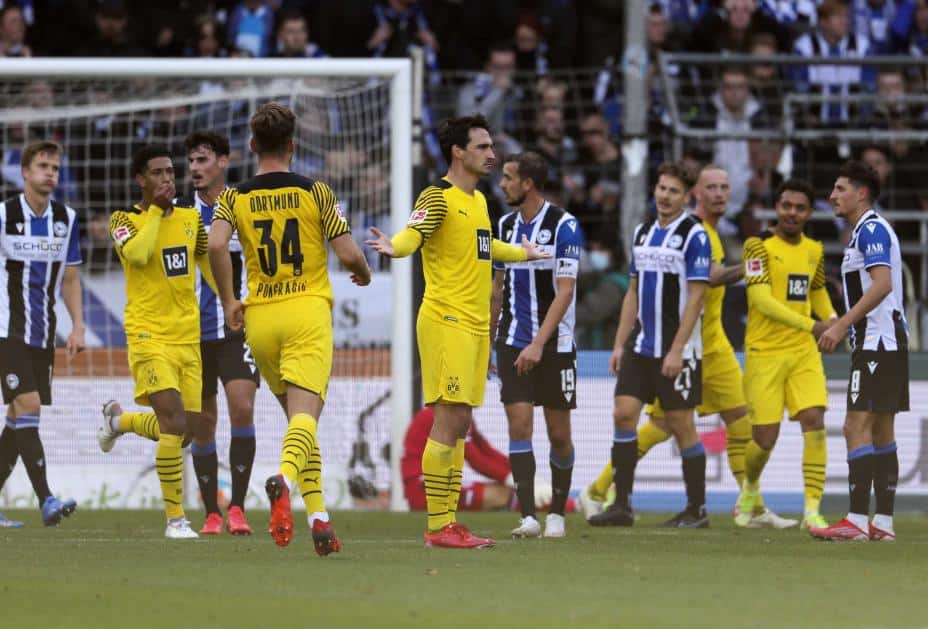 I sluttminuttene sprakk Dortmund-nullen. Arminia Bielefeld reduserte ved Fabian Klos fra krittmerket.