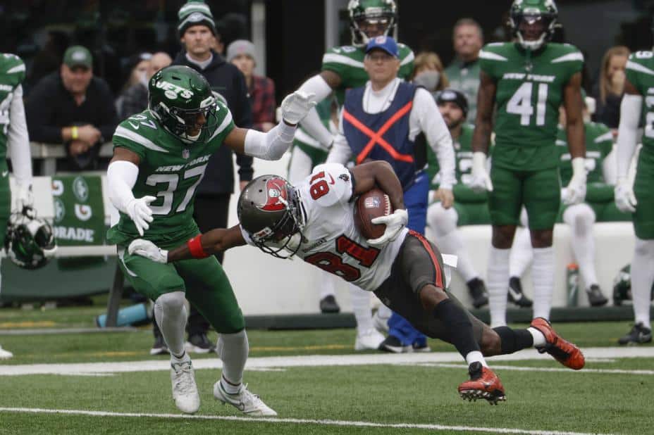 Tittelforsvarer Tampa Bay Buccaneers var i trøbbel mot New York Jets søndag, men avgjorde på tampen. Det kom i skyggen av Antonio Browns farvel til laget.