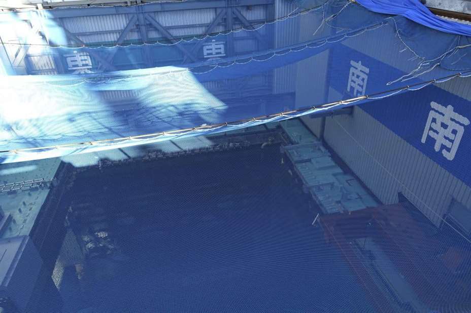 Avkjølingsbasseng der 566 enheter med kjernefysisk drivstoff fra én av tre smeltede reaktorer fra Fukushima Daiichi lagres foreløpig i Okuma, nordøst i Japan. Mandag begynte tømmingen av bassenget, som kan ta opptil to år. Arkivfoto: Mari Yamaguchi / AP / NTB scanpix