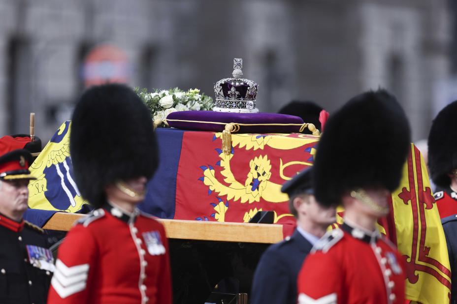 Mandag fraktes kisten den korte veien til Westminster Abbey i sentrum av London, der begravelsen finner sted samme dag.