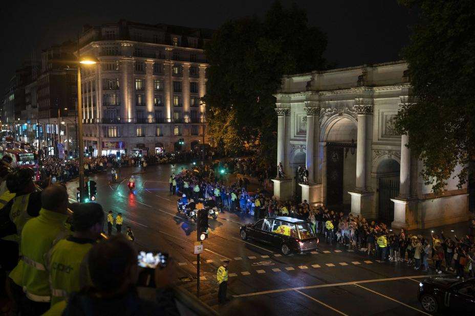 Etter landingen fortsatte båren sin ferd med bil til Buckingham Palace. Der skal den stå i tronsalen over natten, og staben får mulighet til å ta farvel med monarken. Torsdag legges hun igjen på paradeseng, denne gangen i fire dager i Westminster Hall.