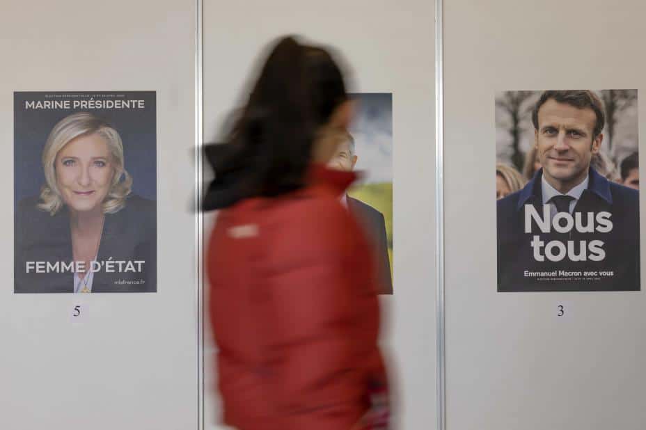 En velger går forbi plakater av de franske presidentkandidatene Marine Le Pen og Emmanuel Macron. Foto: Salvatore Di Nolfi / Keystone via AP / NTB