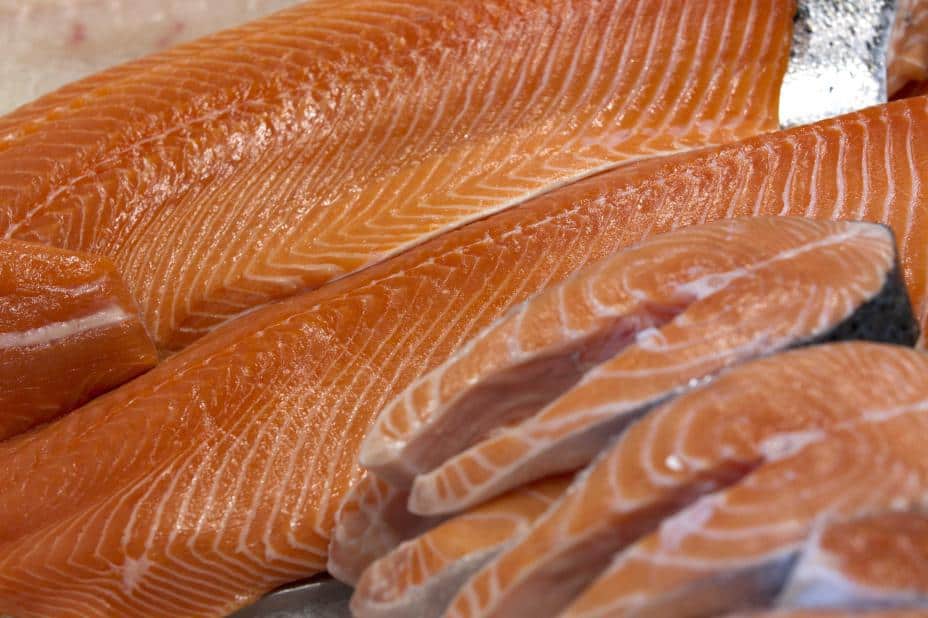 Laksefileter og laksekoteletter i fiskedisken hos en fiskehandler i Oslo sentrum. En storstilt satsing på norsk sjømat skal i høst vekke nordmenn og utlendingers interesse for hva havet har å by på. Foto: Terje Bendiksby / NTB