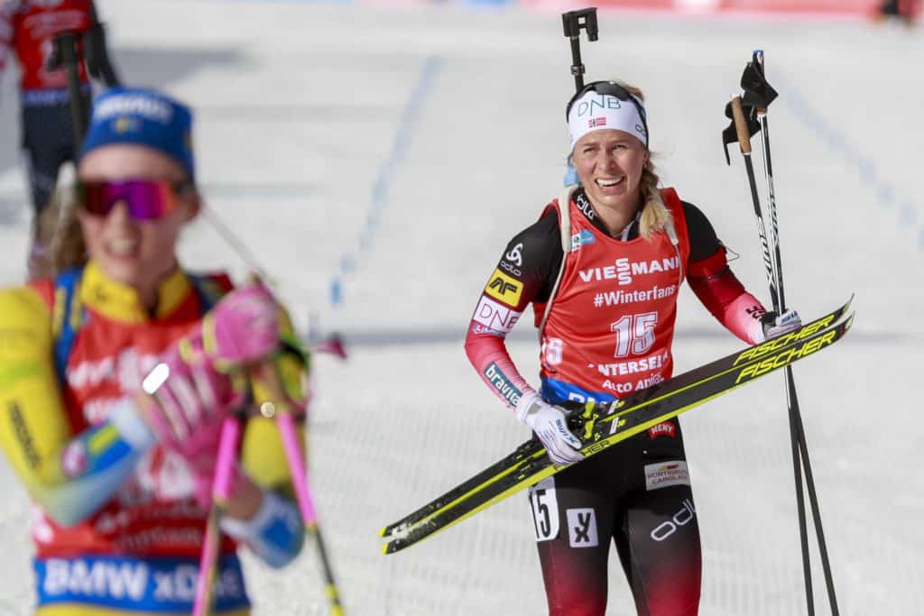 Ingrid Landmark Tandrevold gikk også et strålende løp. 22-åringen øynet fire feilfrie skyteserier, men måtte tåle ett bomskudd på nest siste blink. Hun falt ned fra pallplassen da Eckhoff krysset målstreken.