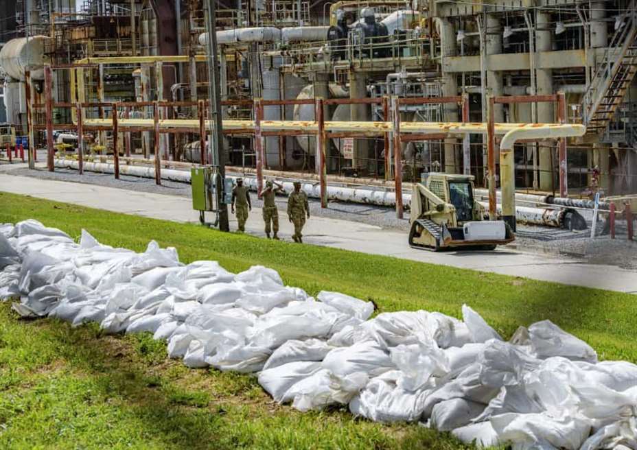 Amerikanske soldater plasserer sandsekker ved et raffineri i Chalmette i Louisiana for å beskytte seg mot stormen Barry som er ventet i løpet av fredag eller lørdag. Foto: AP Photo / Matthew Hinton / NTB scanpix