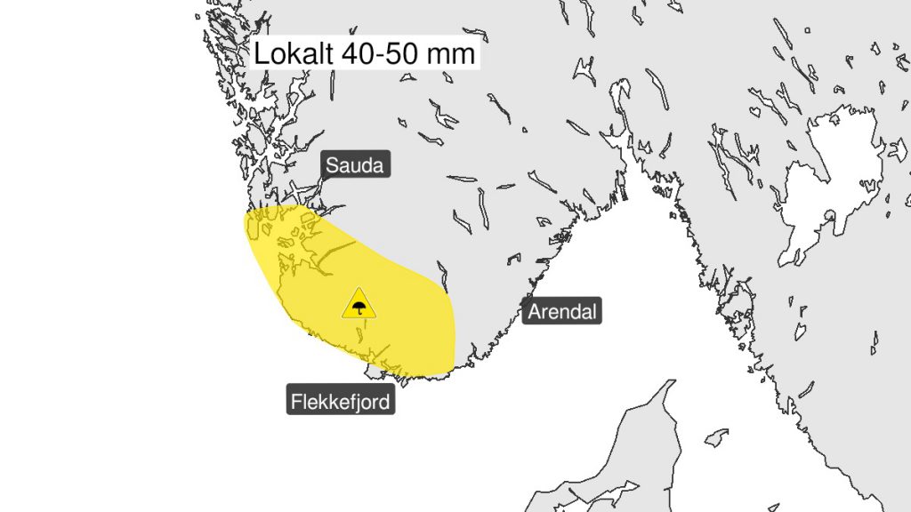 Fra tirsdag ettermiddag til tirsdag kveld ventes lokalt 40-50 mm regn i løpet av 6 timer. Noen omårder kan det bli 60 mm. Nedbøren avtar utover kvelden.
