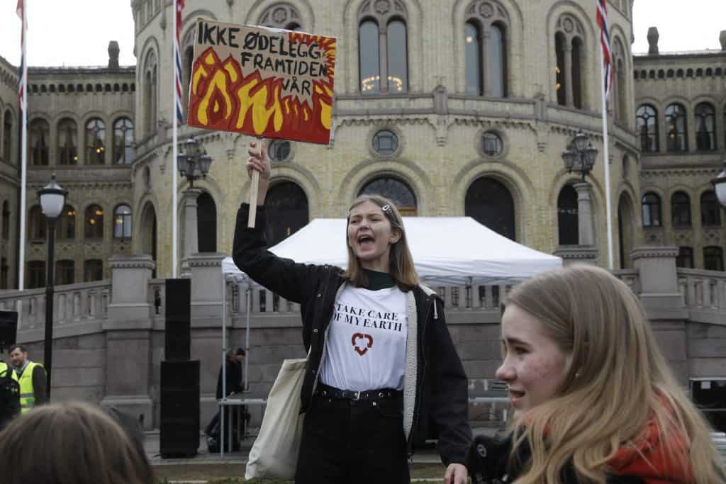 Henny Holtedal fra den franske skolen i Oslo og andre streikende skoleelever er på plass utenfor Stortinget. Foto: Tom Hansen / NTB scanpix