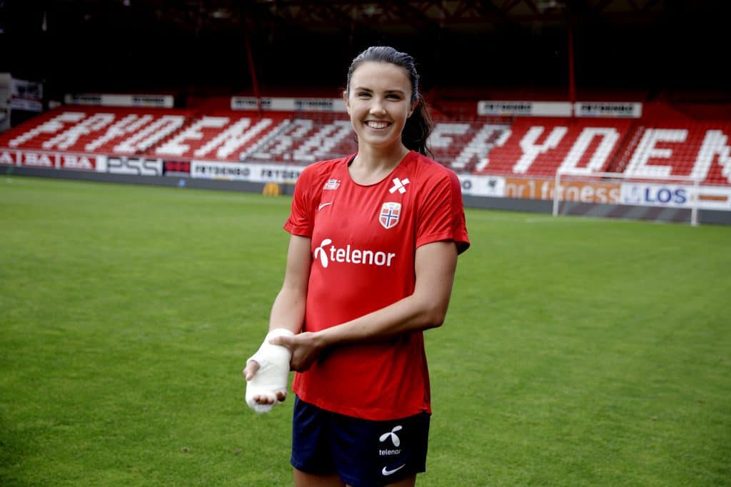 Det ble konstatert brudd i et bein i hånden, og hun spilte med gips da Norge innledet EM-kvalifiseringen med 6-0-seier i Nord-Irland fredag.