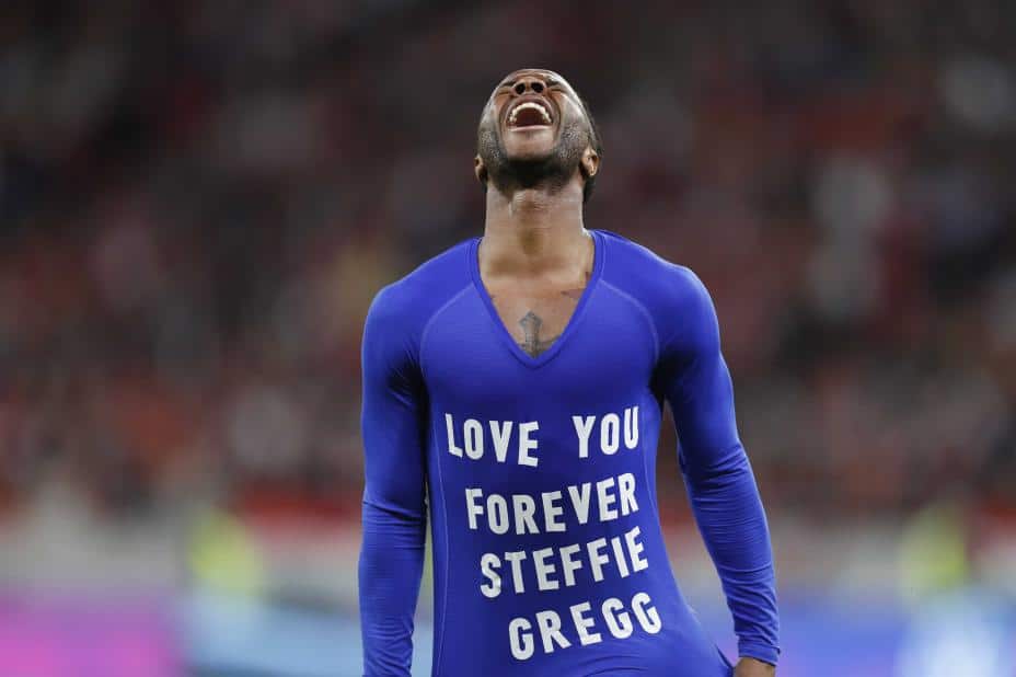 Sterling kastet også drakten etter scoringen. Under hadde han en hyllest til venninnen og sosiale medier-profilen Steffie Gregg, som gikk bort tirsdag som følge av komplikasjoner knyttet til koronaviruset.