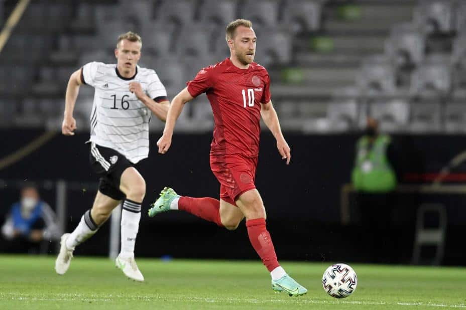 Christian Eriksen i aksjon for Danmark mot Tyskland i oppkjøringen til fotball-EM. Foto: Andreas Schaad / AP / NTB