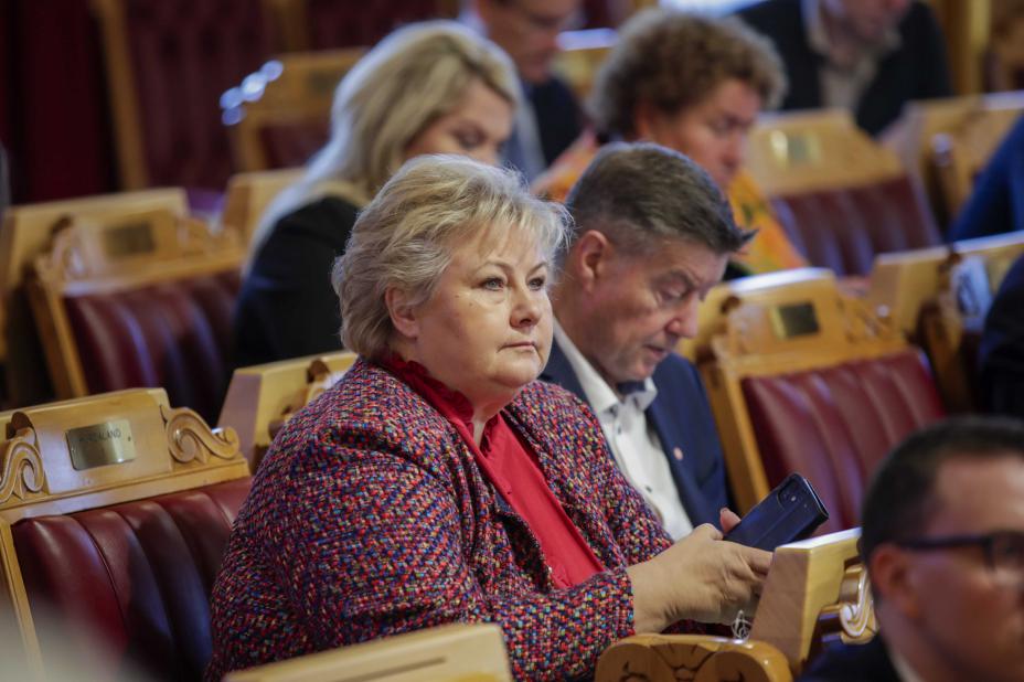 Høyre-leder Erna Solberg er veldig kritisk til det økte skattenivået i budsjettforslaget. Foto: Hanna Johre / NTB