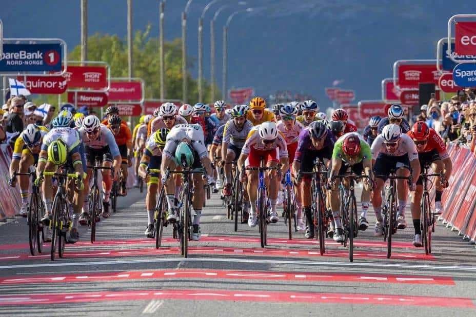 Sluttspurten på fredagens etappe i Arctic Race of Norway. Alexander Kristoff i grønn trøye ble så vidt slått av estiske Martin Laas. Foto: Rune Dahl / NTB