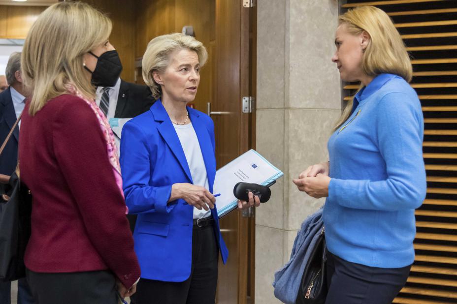 EU-kommisjonen foreslår et midlertidig pristak på gass. Her er kommisjonens president Ursula von der Leyen (midten) i samtaler med energikommissær Kadri Simson. Foto: Geert Vanden Wijngaert / AP / NTB