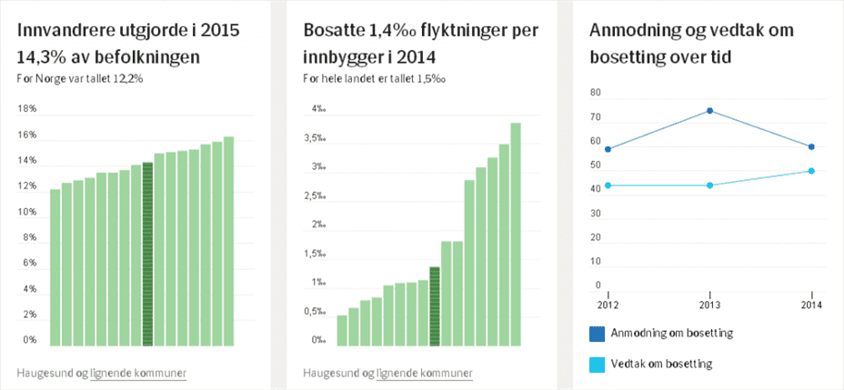 Stavanger kommune bosatte 112 flyktninger mens Haugesund kommune bosatte 50 flyktninger i 2014. Det er 0,8 personer per 1000 innbyggere for Stavanger, 1,4 personer per 1000 innbyggere for Haugesund.