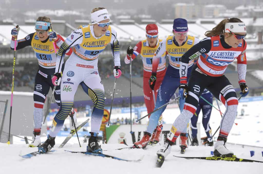 Maiken Caspersen Falla slapp svenske Maja Dahlqvist forbi seg i siste sving og måtte dermed ta til takke med 2.-plass søndagens lagsprint i Lahti.