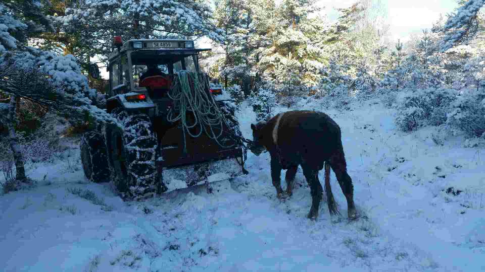 – Han ble veldig fort skeptisk til folk og vi klarte ikke å lokke ham inn. Vi passet heldigvis på å fôre ham mens han var ute. Til slutt fikk vi med oss dyrlegen som satte en bedøvelsespil i ham. Deretter brukte vi tre tau for å dra ham inn på fjøset, forteller bonde Steinar Nesse til NRK.