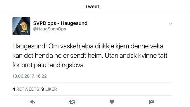 I forrige uke skapte politiet i Haugesund reaksjoner med denne med meldingen om en «vaskehjelp» som ble sendt ut av landet.