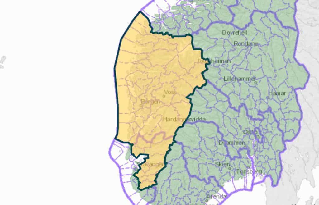NVE har sent ut varsel om jord-, sørpe- og flomskredfare på gult nivå for Vestland fylke og deler av Rogaland.