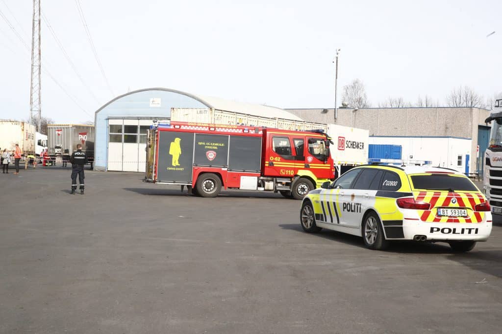 Det er hos transportfirmaet Schenker at lekkasjen har skjedd, får NTB bekreftet. Ifølge politiet er det snakk om en mindre lekkasje av en sterk rensevæske for plast.