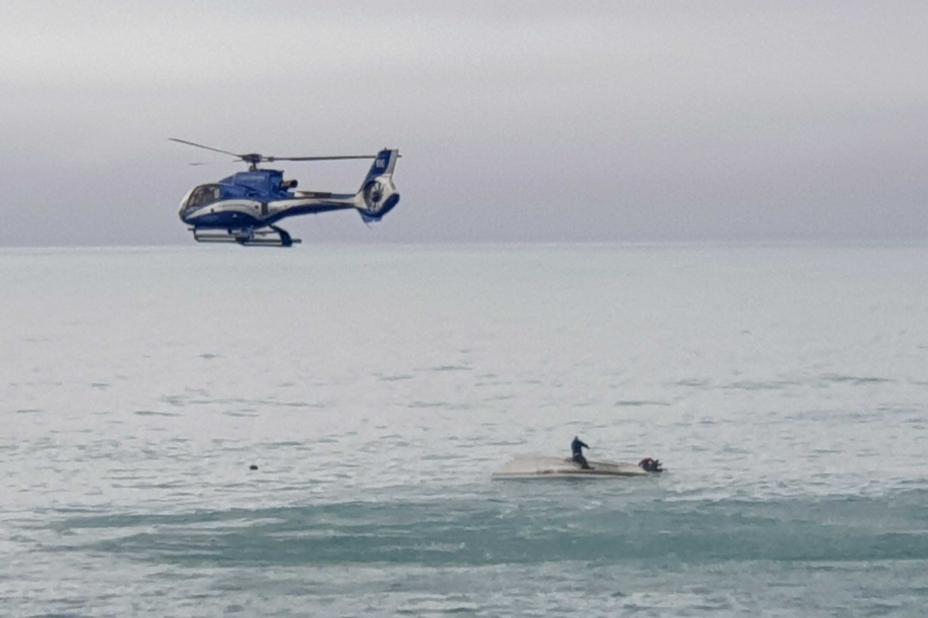 En av de overlevende sitter på den kantrede båten utenfor Kaikoura på New Zealand. Et helikopter flyr over området der ulykken skjedde. Foto: AP / NTB