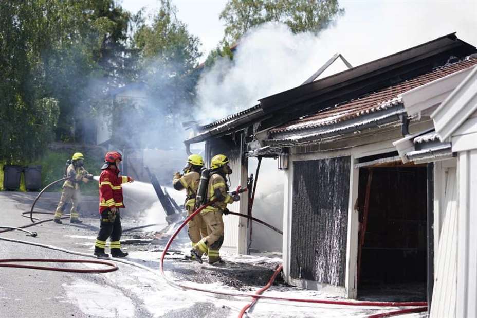 De mottok melding om brannen kl. 15.43. Det var en nabo som ringte inn og meldte om mye røyk fra garasjerekken.