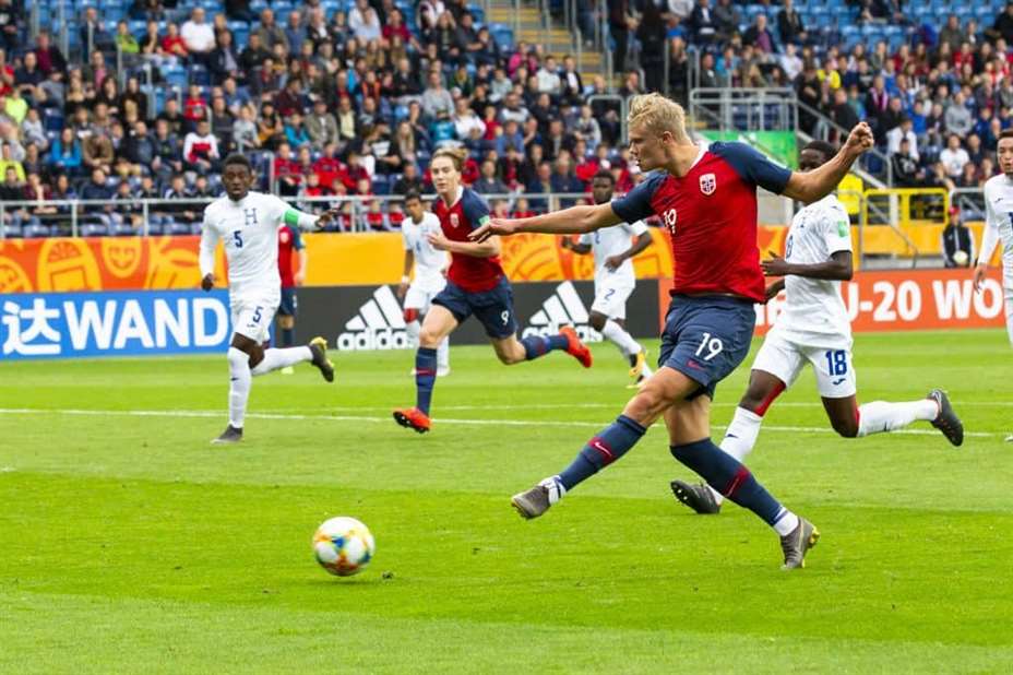 Erling Braut Håland scoret ni ganger da Norge slo Honduras 12–0 i fotball-VM for U20-lag. Foto: Svein Ove Ekornesvåg / NTB scanpix