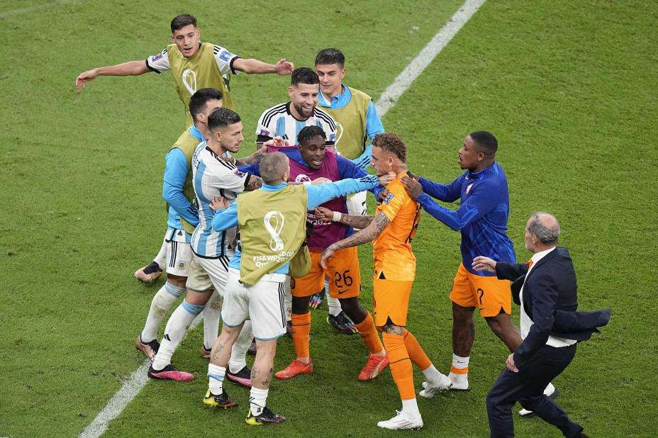 Argentinas innbyttere og trenere gikk inn på banen sent i kampen da Nederland scoret to mål og tvang fram ekstraomganger. Det var også flere opphetede utvekslinger mellom spillerne etter at Argentina vant straffesparkkonkurransen.