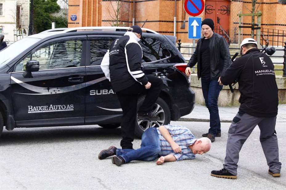 Det har vært innspilling av filmen "Run Faster" i Haugesund i dag. I en av scenene blir skuespiller for anledningen, sentrumsleder Odd Fossan-Waage, slått ned utenfor Vår Frelsers kirke.