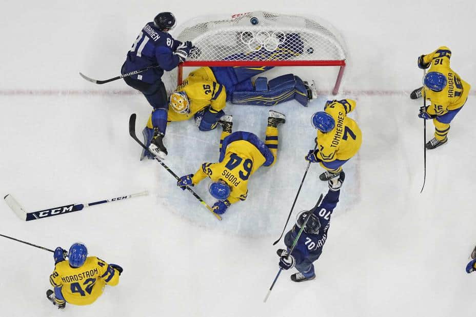 Sveriges ishockeylandslag ledet 3-0 over Finland før siste periode, men finnene slo tilbake og vant 4-3 etter forlengning. Begge er i kvartfinale.