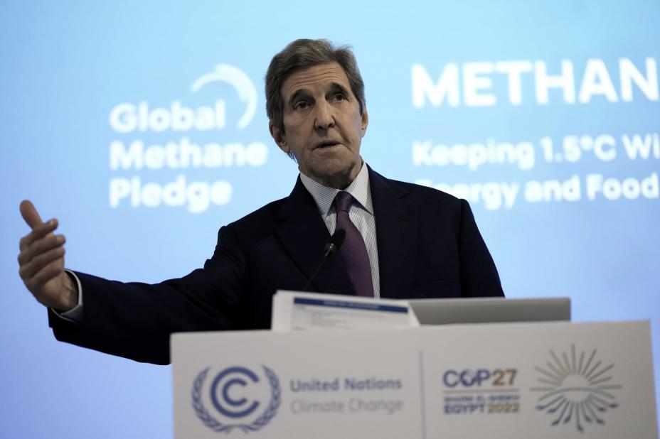Vær: Det opplyste USAs klimautsending John Kerry på klimatoppmøtet i Egypt torsdag. Til sammen har om lag 150 land undertegnet Global Methane Pledge.