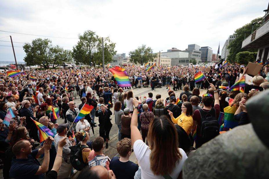 NTBs reporter på stedet kunne fortelle at setningen «Pride er og har alltid vært en kamp», ble sagt til stor jubel. Det var også et stort politioppbud ved rådhuset, og politiet var bevæpnet med pistoler.