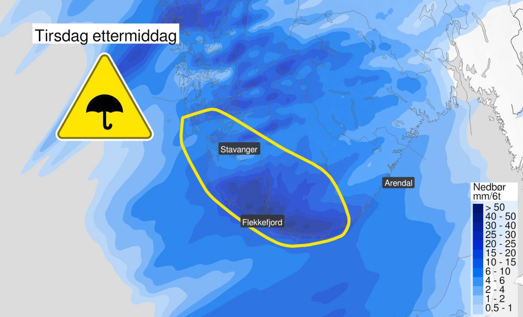 – I morgen ettermiddag ventes det enkelte steder 40 til 50 millimeter i løpet av bare seks timer i deler av Rogaland og Agder, skrives det i en melding.