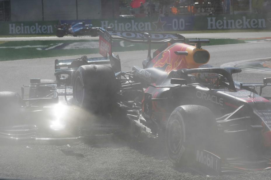 VM-rivalene Lewis Hamilton og Max Verstappen brøt Italias Grand Prix etter en dramatisk kollisjon. Daniel Ricciardo og Lando Norris sikret McLaren-dobbel.