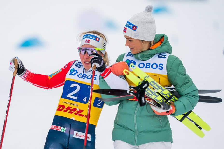 Helene Marie Fossesholm (20) fikk hjelp av Therese Johaug (33) til å komme seg ut av stadion etter verdenscupstafetten i langrenn i Lillehammer.