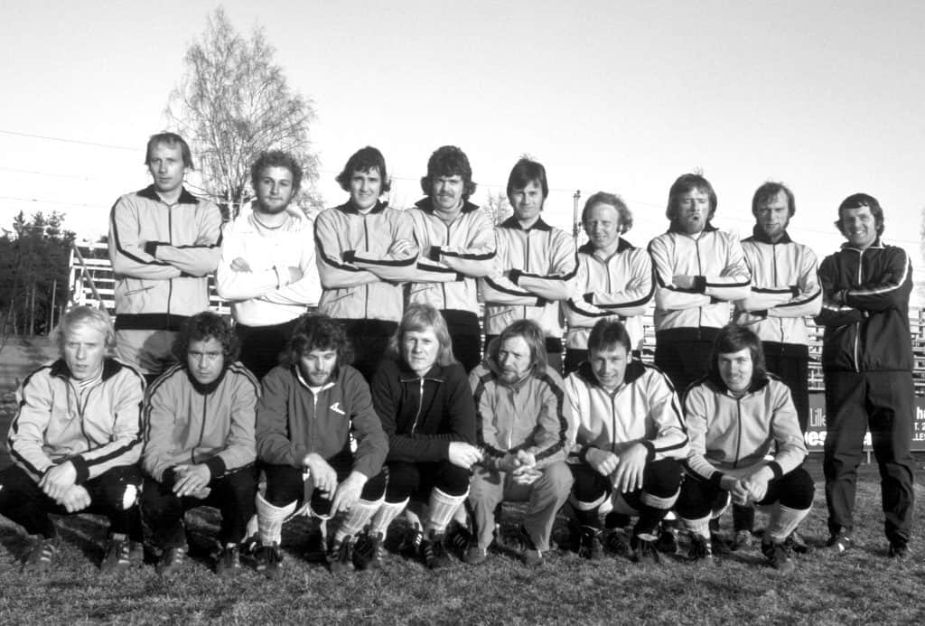 Joar Hoff (ytterst til høyre) med Lillestrøms tropp i toppserien fotball i 1975, den første av en sammenhengende rekke sesonger på øverste nivå i fotball som ennå ikke er brutt. Arkivfoto: NTB scanpix
