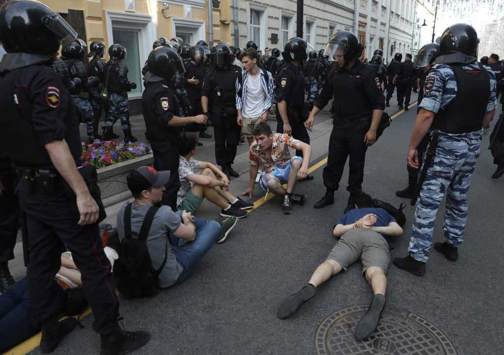 Politifolk pågrep nesten 1.400 demonstranter i Moskva lørdag. Foto: Pavel Golovkin / AP / NTB scanpix