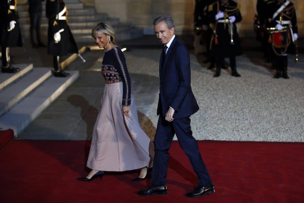 LVMH-sjef Bernard Arnault og kona Helene Mercier på rød løper utenfor Elysee-palasset i Paris. LVMH donerer 200 millioner euro (nærmere 2 milliarder kroner) til gjenoppbyggingen av Notre-Dame. Foto: AP / NTB scanpix