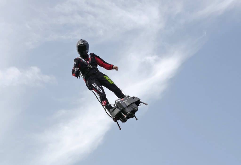 Den franske oppfinneren fikk mye oppmerksomhet da han 14. juli fløy over Paris med svevebrettet han har bygget selv. Bildene av ham gikk verden over på den franske nasjonaldagen.