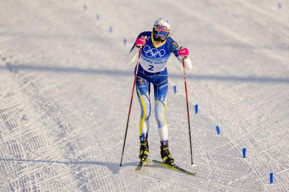 Frida Karlsson besvimte etter 15 kilometer skiathlon. Den svenske langrennsstjernen ble nummer fem da Therese Johaug vant OLs første øvelse.