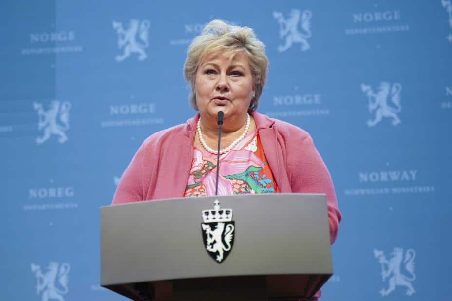 Statsminister Erna Solberg under fredagens pressekonferanse om koronasituasjonen. Foto: Javad Parsa / NTB.