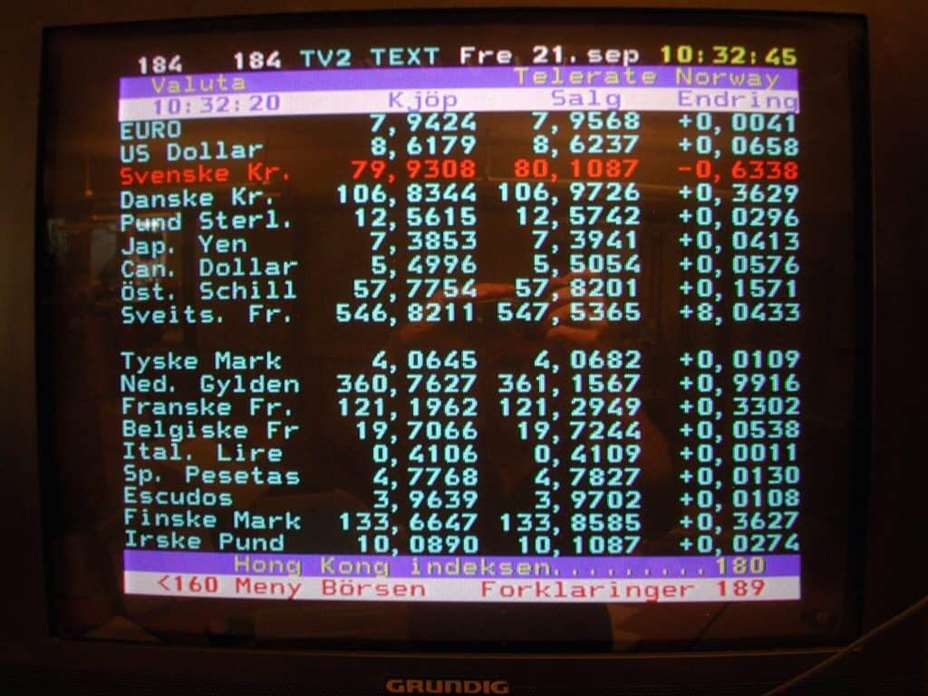 TV 2s gamle tekst-TV-tjeneste, som nå er lagt ned. GET sier det ikke er tekst-TV i deres nye dekodere. Foto: Per Løchen / NTB scanpix