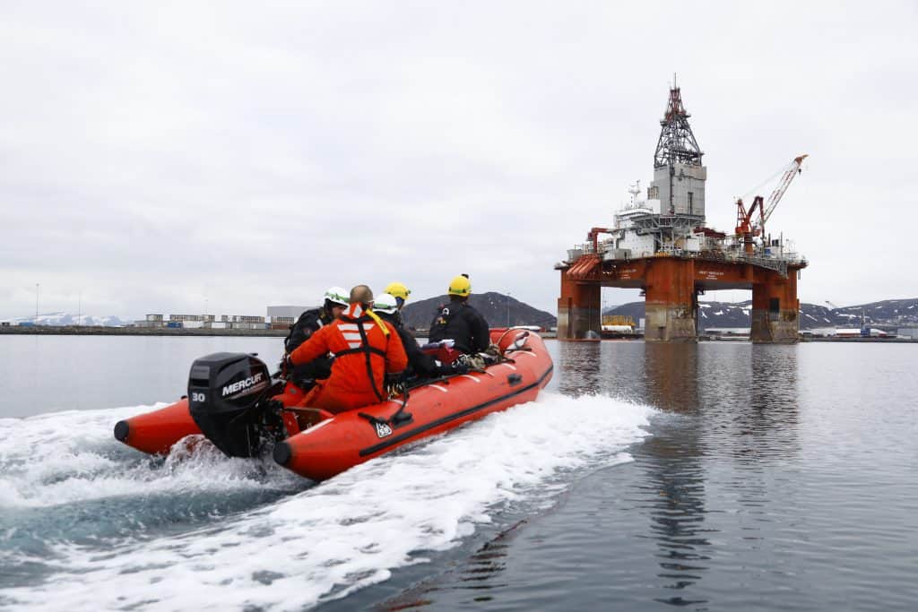Aktivister fra Greenpeace og Natur og Ungdom gikk til aksjon mot oljeriggen West Hercules mandag morgen. Riggen ligger utenfor Hammerfest og klargjøres for oljeboring i Barentshavet. Foto: Jonne Sippola / Greenpeace / NTB scanpix