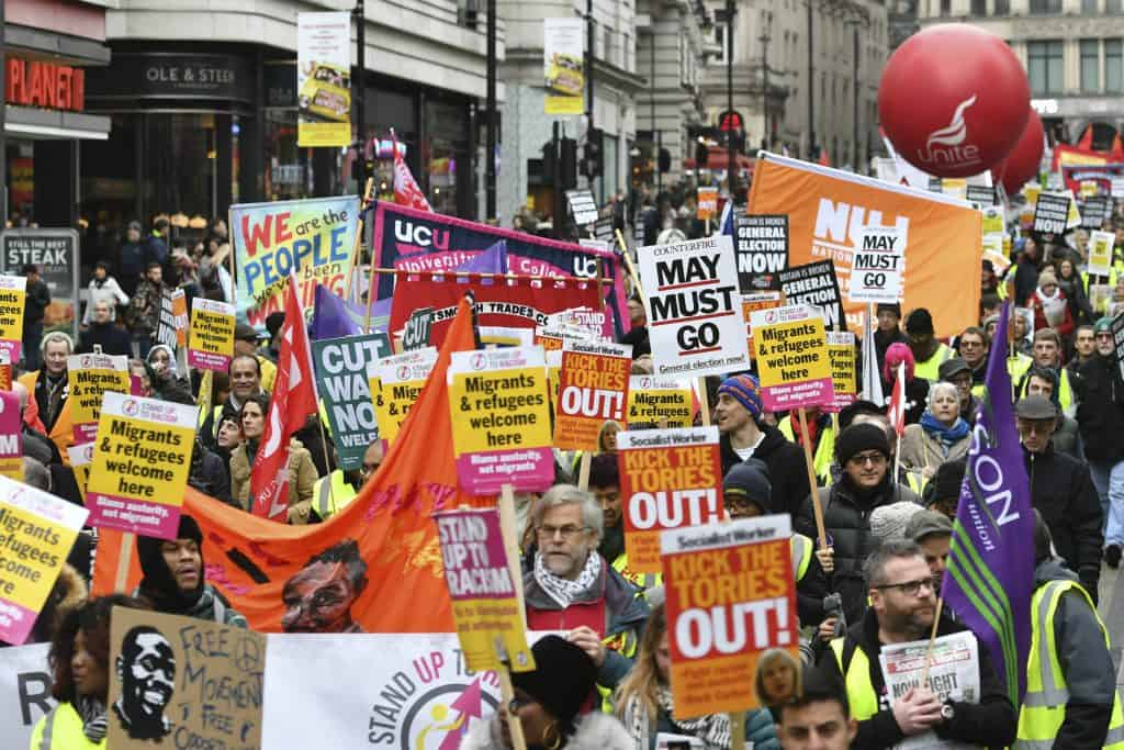 Demonstrantene som gikk gjennom Londons gater lørdag, krever ny regjering. Foto: AP / NTB scanpix