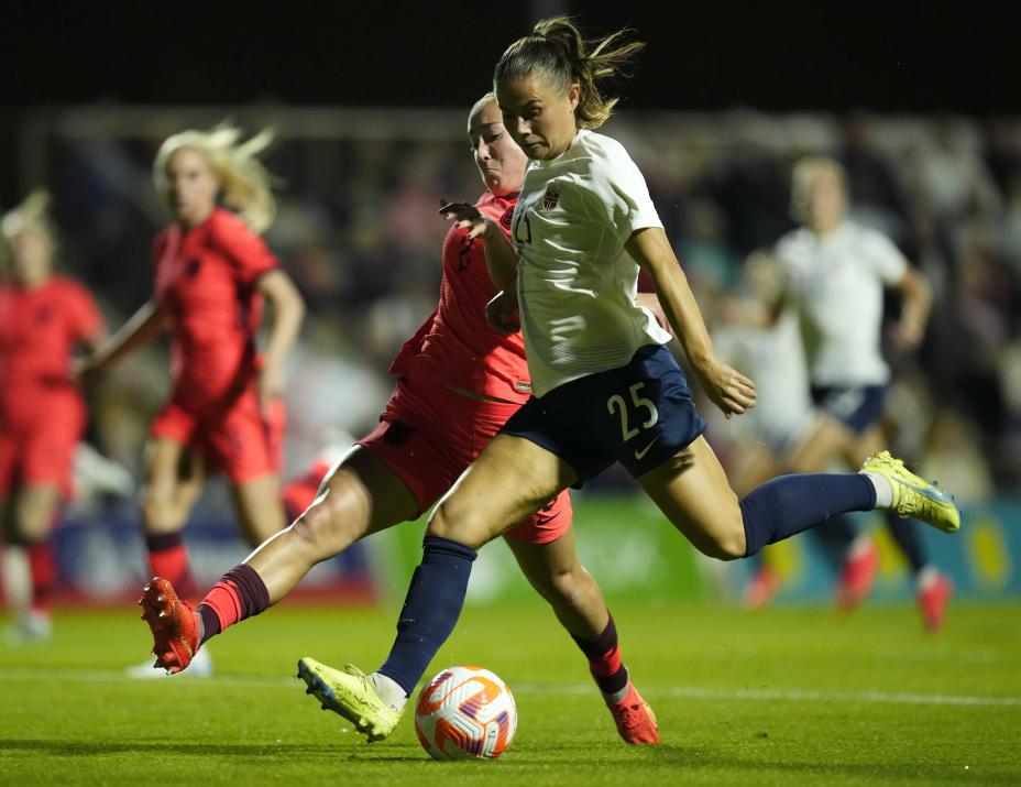 Emilie Haavi var involvert i ledermålet da Roma spilte 1-1 mot Wolfsburg i mesterligaen. Her i aksjon for Norge i landskamp mot England nylig. Foto: Jose Breton, AP / NTB