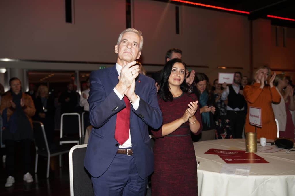 Partileder Jonas Gahr Støre og nestleder Hadia Tajik under valgvaken til Arbeiderpartiet i Folkets Hus i Oslo. Foto: Fredrik Hagen / NTB scanpix