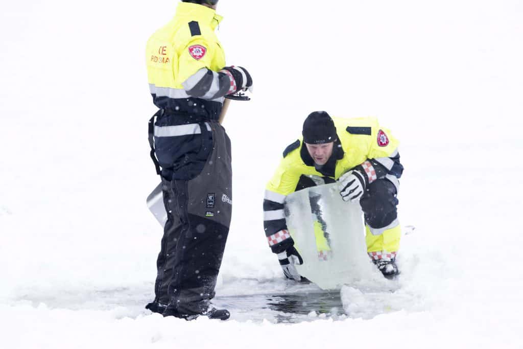 Det er sagd ut seks hull som følger vannlinjen fra familiens eiendom og mot brua i enden av vannet, der det er et elveutløp. Dykkerne fra brannvesenet søker visuelt både innover mot land og utover fra hullene i isen.