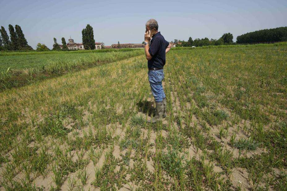 Bonden Giovanni Daghetta på en uttørket rismark i Mortara i regionen Lombardia i Nord-Italia i slutten av juni. Illustrasjonsfoto: Luca Bruno / AP / NTB
