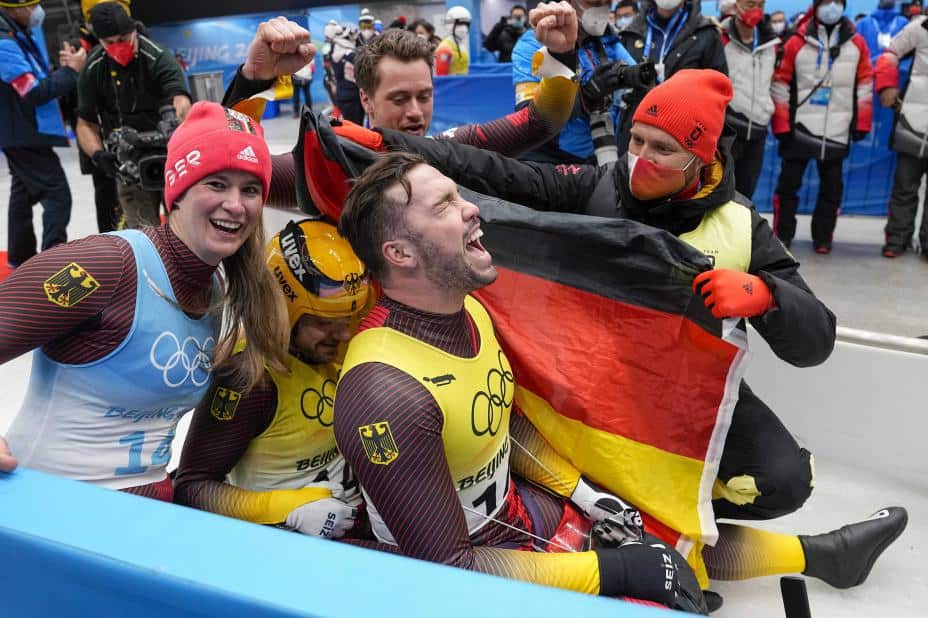 Tysklands individuelle gullvinnere Natalie Geisenberger og Johannes Ludwig var henholdsvis 36 og 65 hundredeler bak etter sine etapper, og da ble alt opp til Tobias Wendl og Tobias Arlt, som onsdag tok sitt tredje strake OL-gull i double. Det lyste rødt gjennom det meste av banen, men på siste mellomtid skiftet det til grønt, og i mål var de åtte hundredeler foran Østerrike.